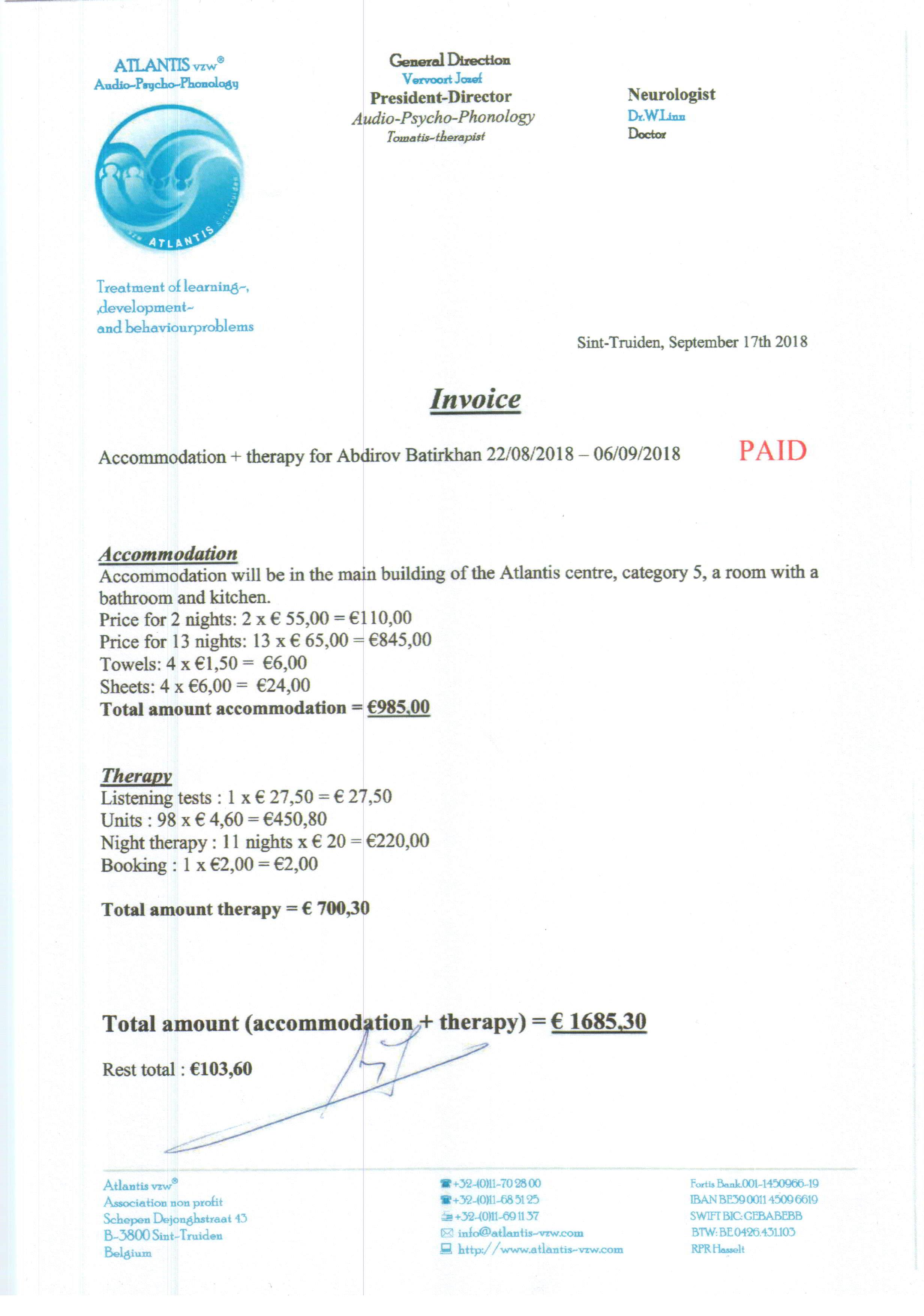 Уважаемая Татьяна Васильевна, прошу Вас помочь моему сыну Абдирову Батырхану, 07.08.2009 г.р., диагноз аутизм, СДВГ, ЗППР, РОП ЦНС, гипертензионно-гидроцефальный синдром, СМА, дизартрия. Сыну 7 августа будет 8 лет, до сих пор не говорит, неусидчив, гиперактивен, проблема с социализацией, не берут не в садик, не в спецшколу.Получил все бесплатные лечения, но ни от одного не было никаких результатов. Чтобы поехать на платное лечение нет никакой возможности. Сама одна воспитываю двоих детей и дочка плохо говорит. Вот уже более 10 лет переезжаю с квартиры на квартиру. Отец бросил детей, от него нет никакой помощи. Хочу поехать с сыном на лечение. Прошу Вас пожалуйста, помогите с поездкой на лечение в Бельгию, собрать необходимую сумму 2185 евро.