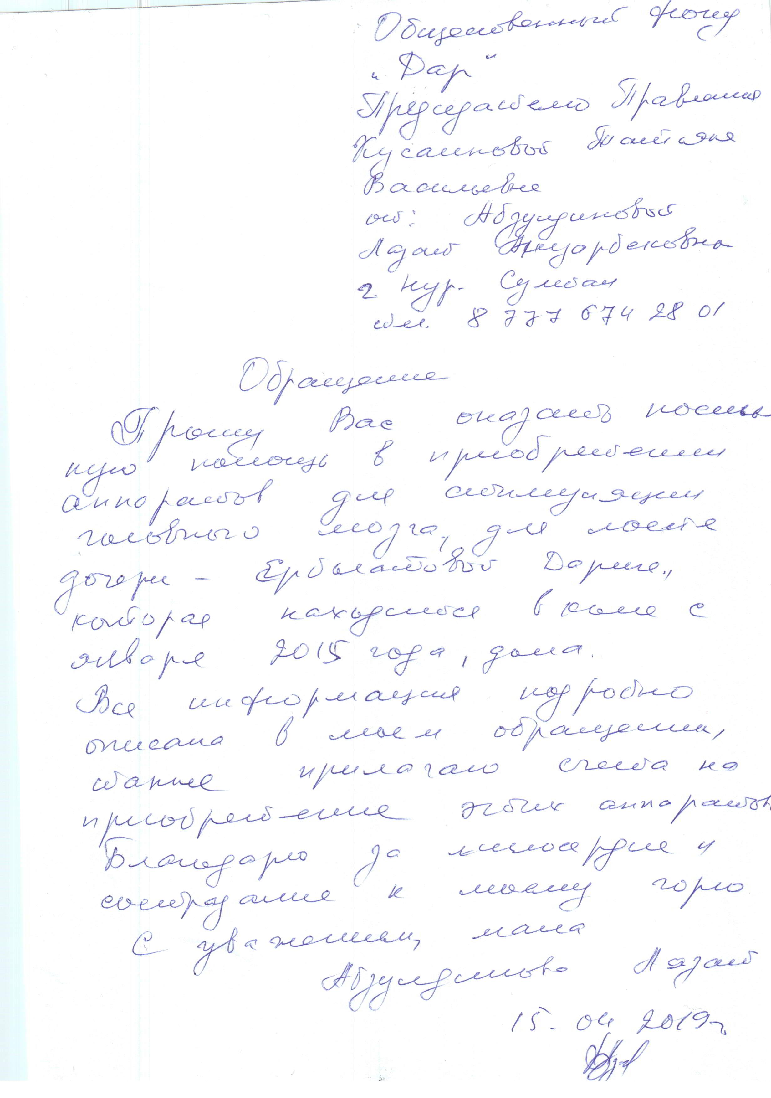 К нам обратилась мама Ерболатовой Дариги, которой необходим аппарат для стимуляции головного мозга, так как на данный момент врачи отказались от лечения и признали свою беспомощность.